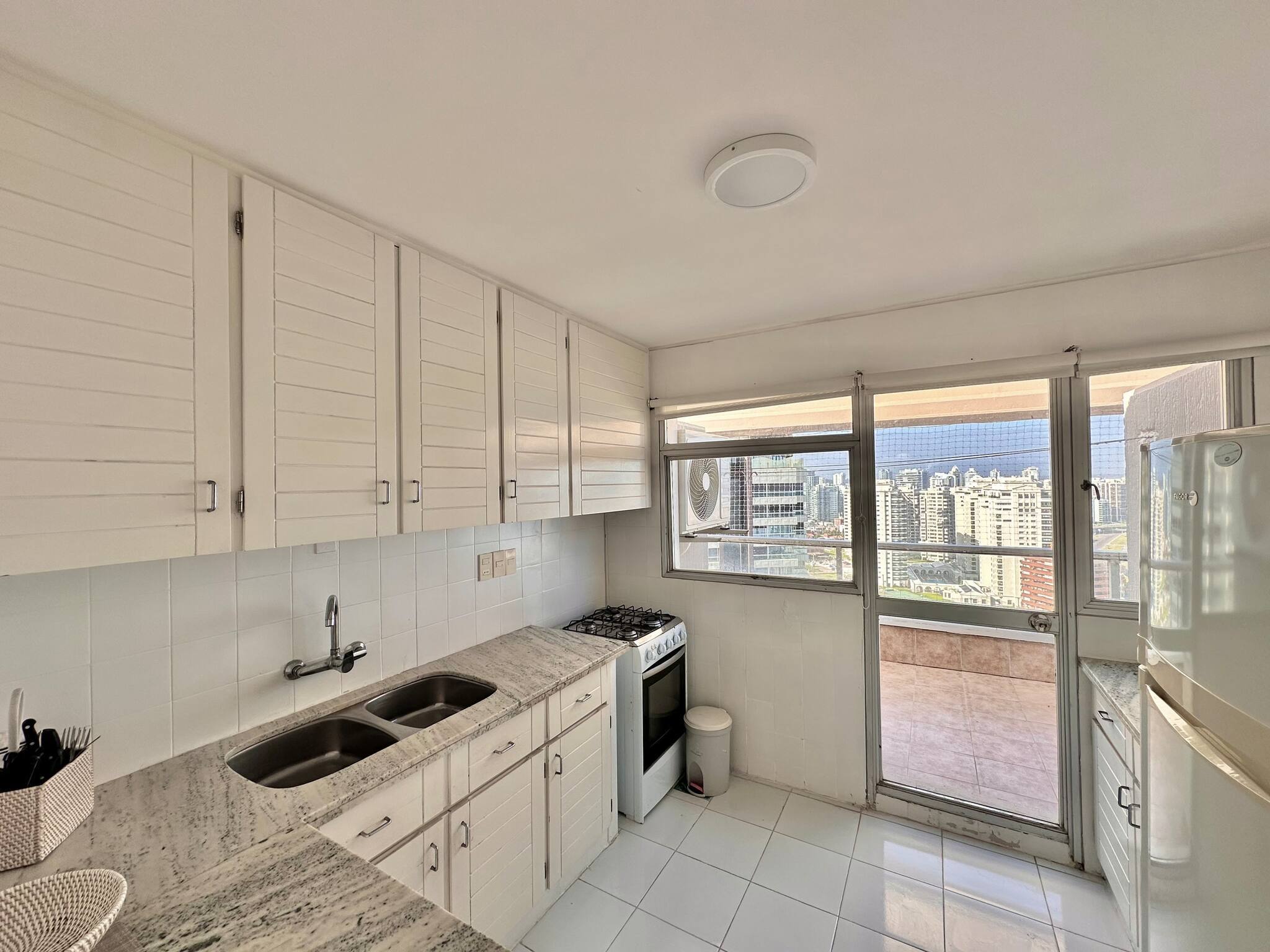 El apartamento dispone de un gran salón con estufa a leña y un baño social. Además, la cocina es independiente, completamente equipada y cuenta con una excelente área de barbacoa en la terraza.