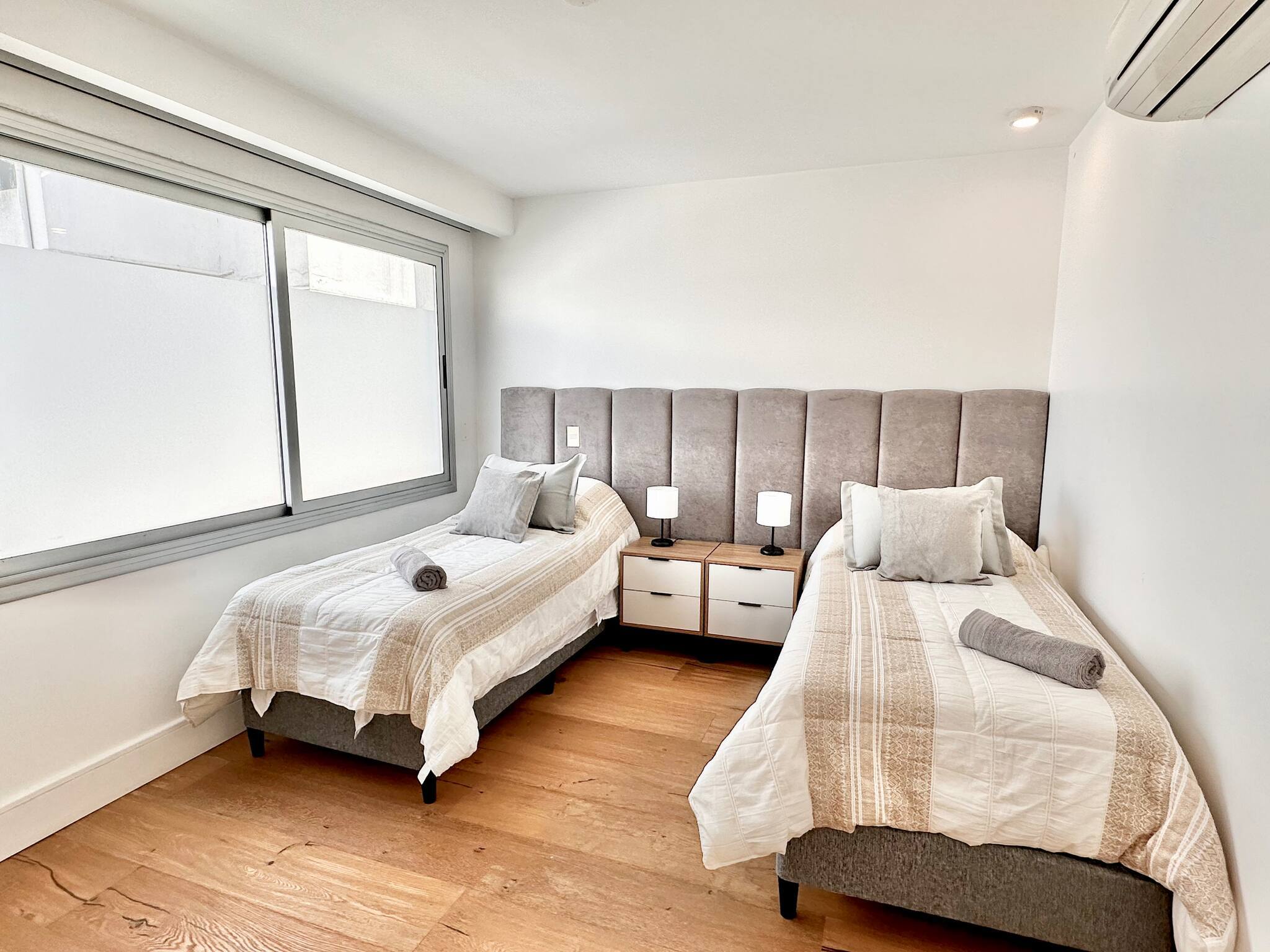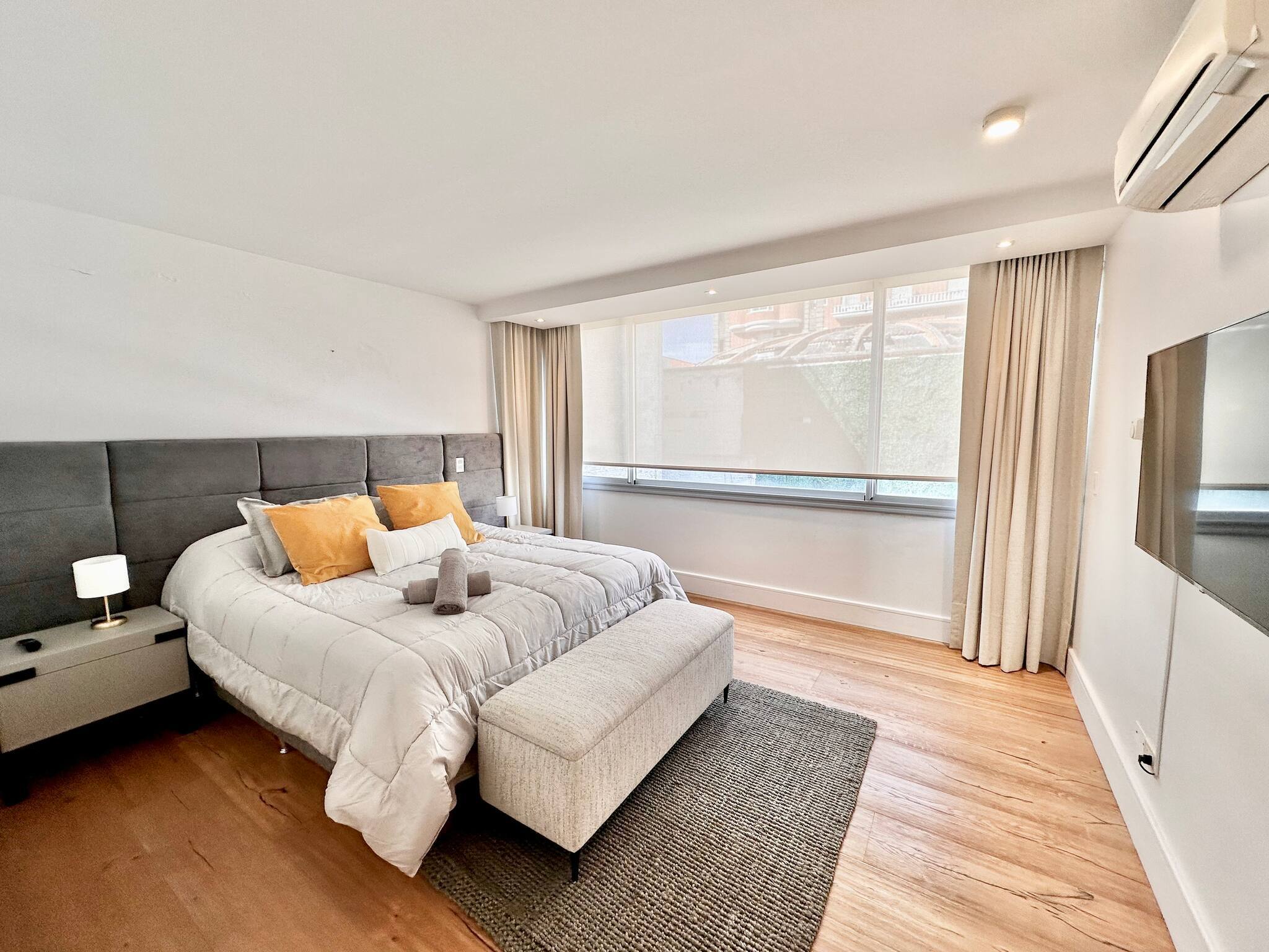 El apartamento cuenta con 3 habitaciones en suite, la principal con vestidor. Además hay una habitación de servicio, también con baño muy prolija, la cual podría utilizarse como dormitorio para un huésped adicional.