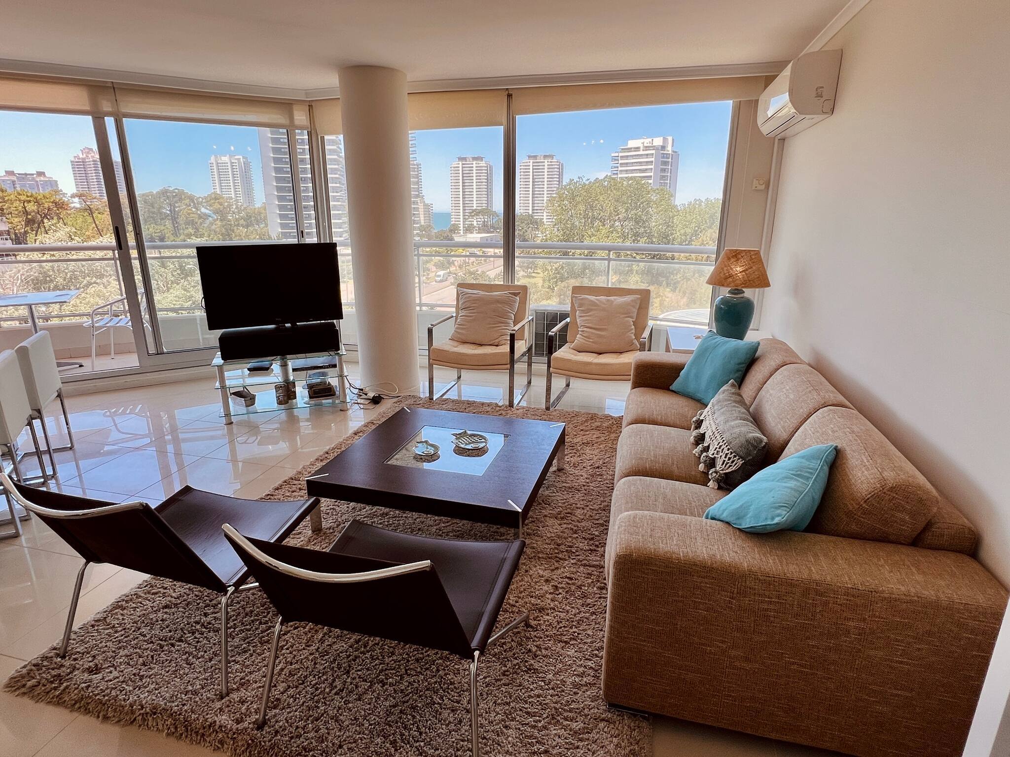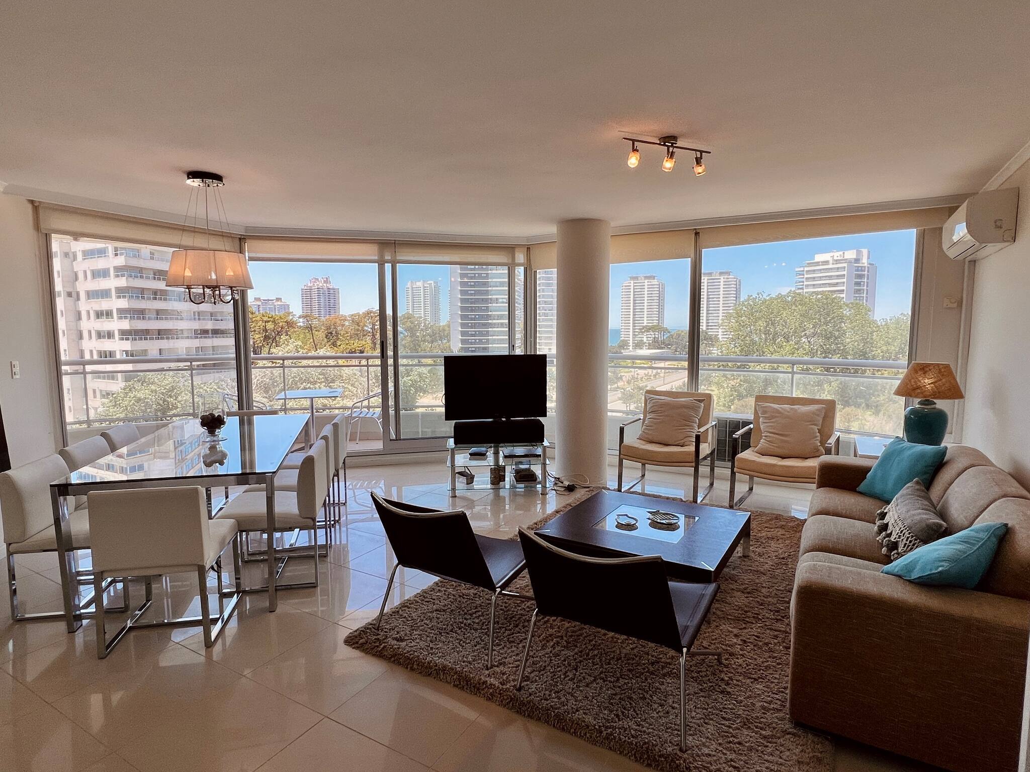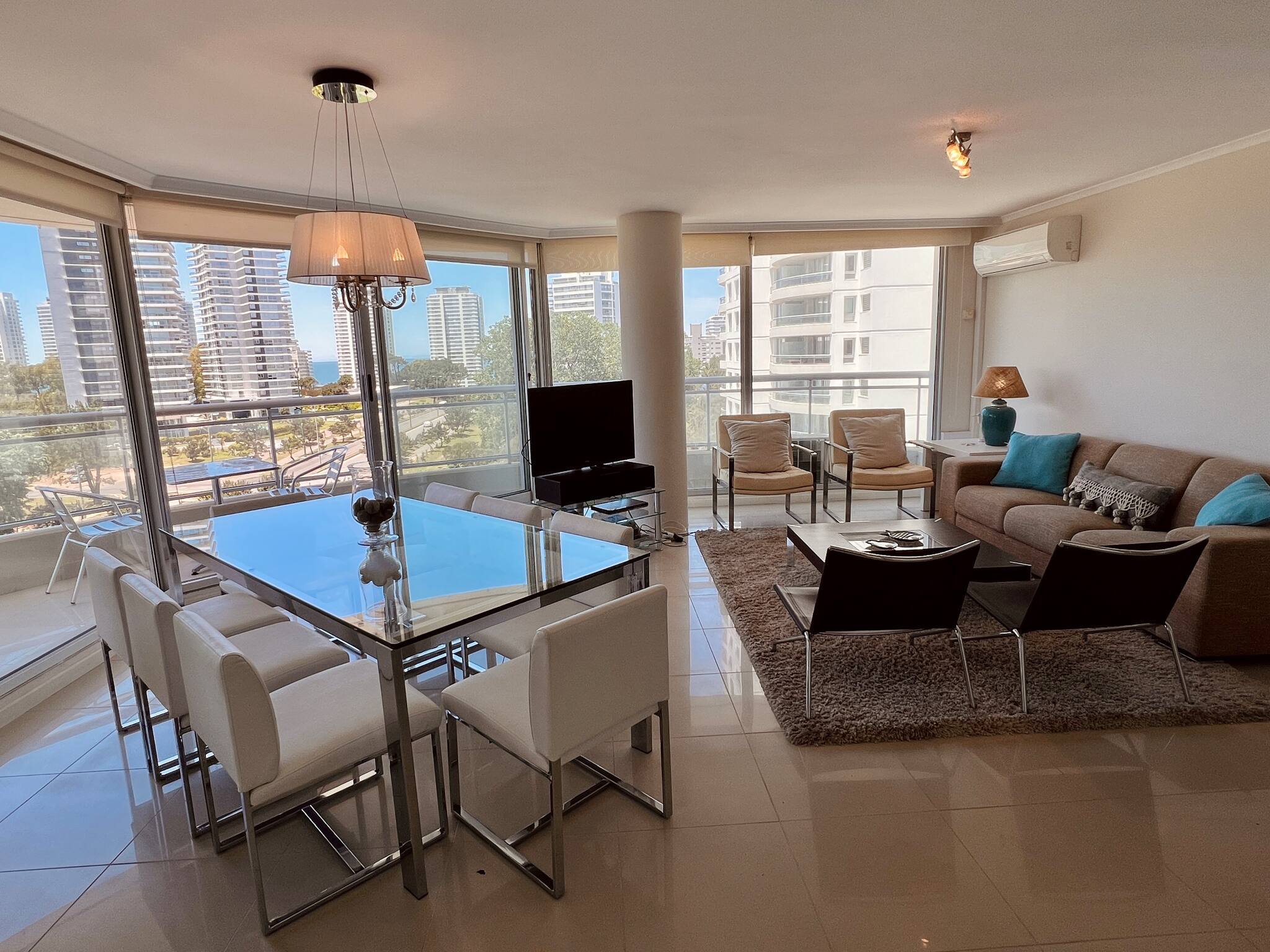 Living comedor con espectaculares vistas al atardecer y terraza con parrillero propio. Todo equipado con mobiliario de excelente diseño.