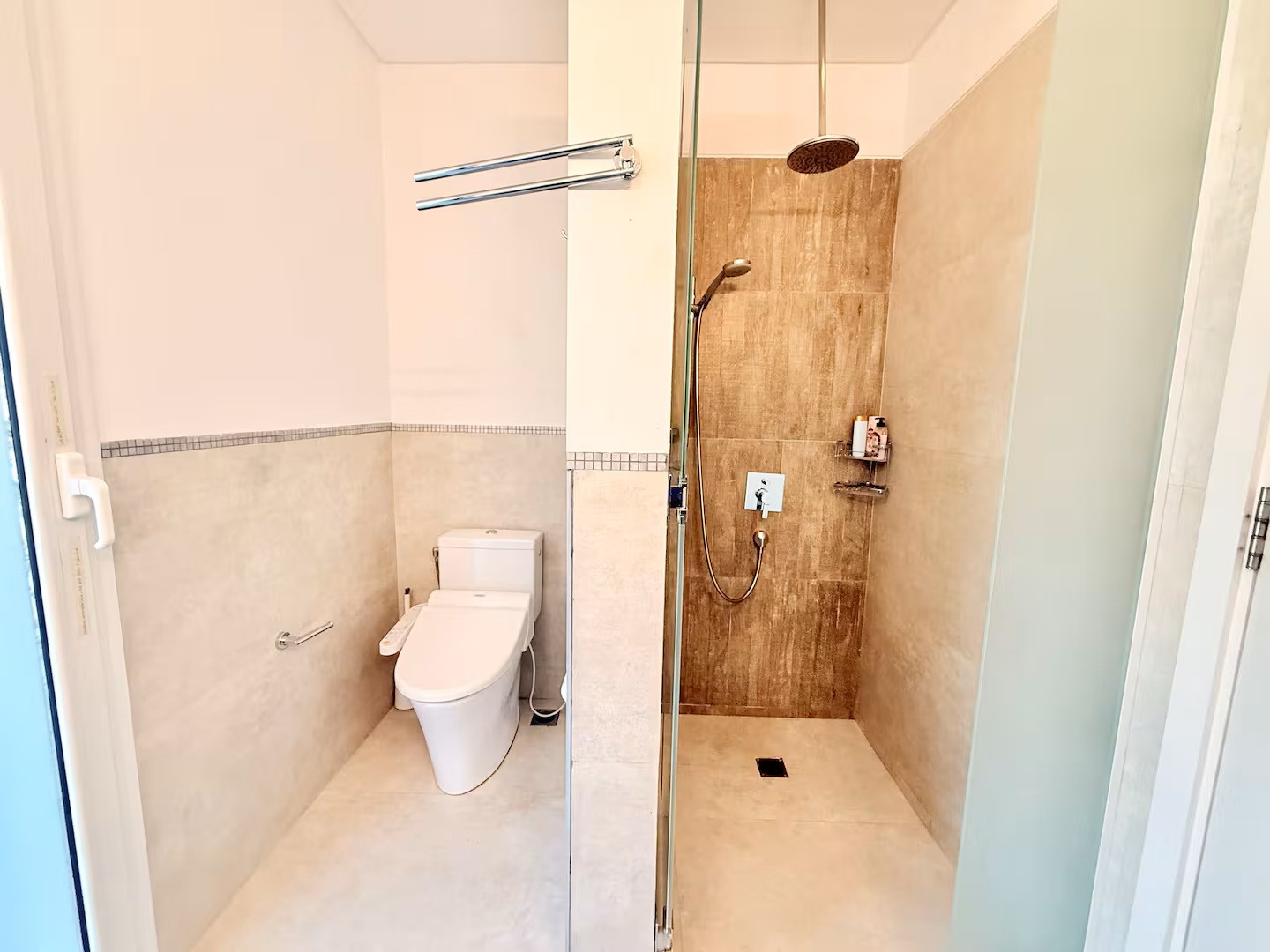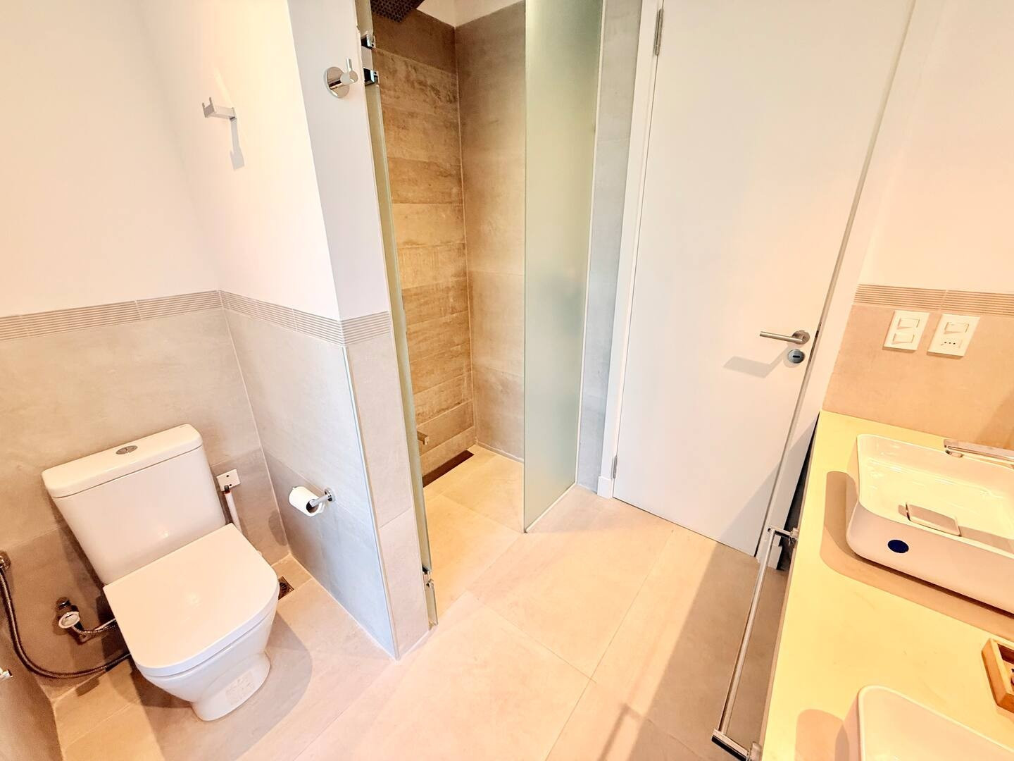 Habitación 1) en planta alta con baño completo en suite, balcon, TV con Apple TV. 1 cama matrimonial tamaño king size, aire acondicionado frio/calor. Placa de calefacción