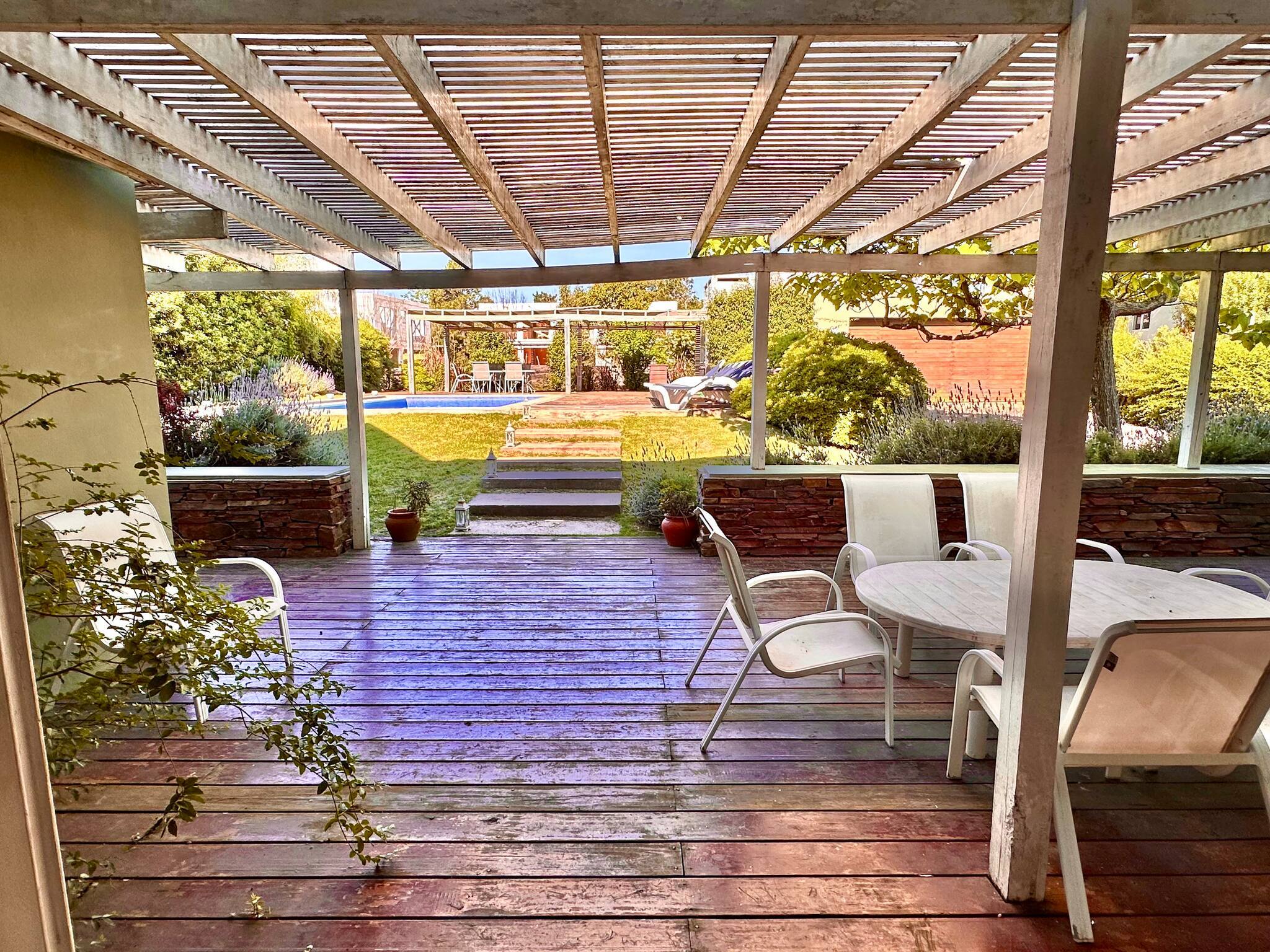 4 dormitorios en suite, toilette y baño de servicio, grandes espacios comunes con cocina integrada al living y comedor, escritorio, hogar, gran deck con parrillero y muy bien amoblado para máximo disfrute. Amplios jardines hacia los tres lados de la casa.
