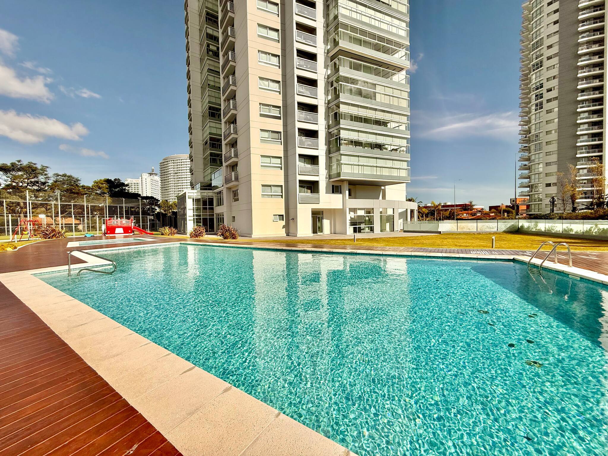 O apartamento em Punta del Este tem 2 quarto(s) e capacidade para 4 pessoa(s). Alojamento de 120 m². Dispõe de elevador, jardim, mobiliário de jardim, 20 m² de terraço, máquina de lavar roupa, máquina de secar roupa, churrasqueira, ferro de engomar, secador de cabelo, varanda, zona infantil, campo de ténis, ginásio, jacuzzi, spa, piscina comunitária, 2 Televisores.A cozinha é independente, eléctrica, está equipada com frigorífico, microondas, forno, congelador, louça/talheres, utensílios/cozinha, máquina de café, torradeira e jarro eléctrico.