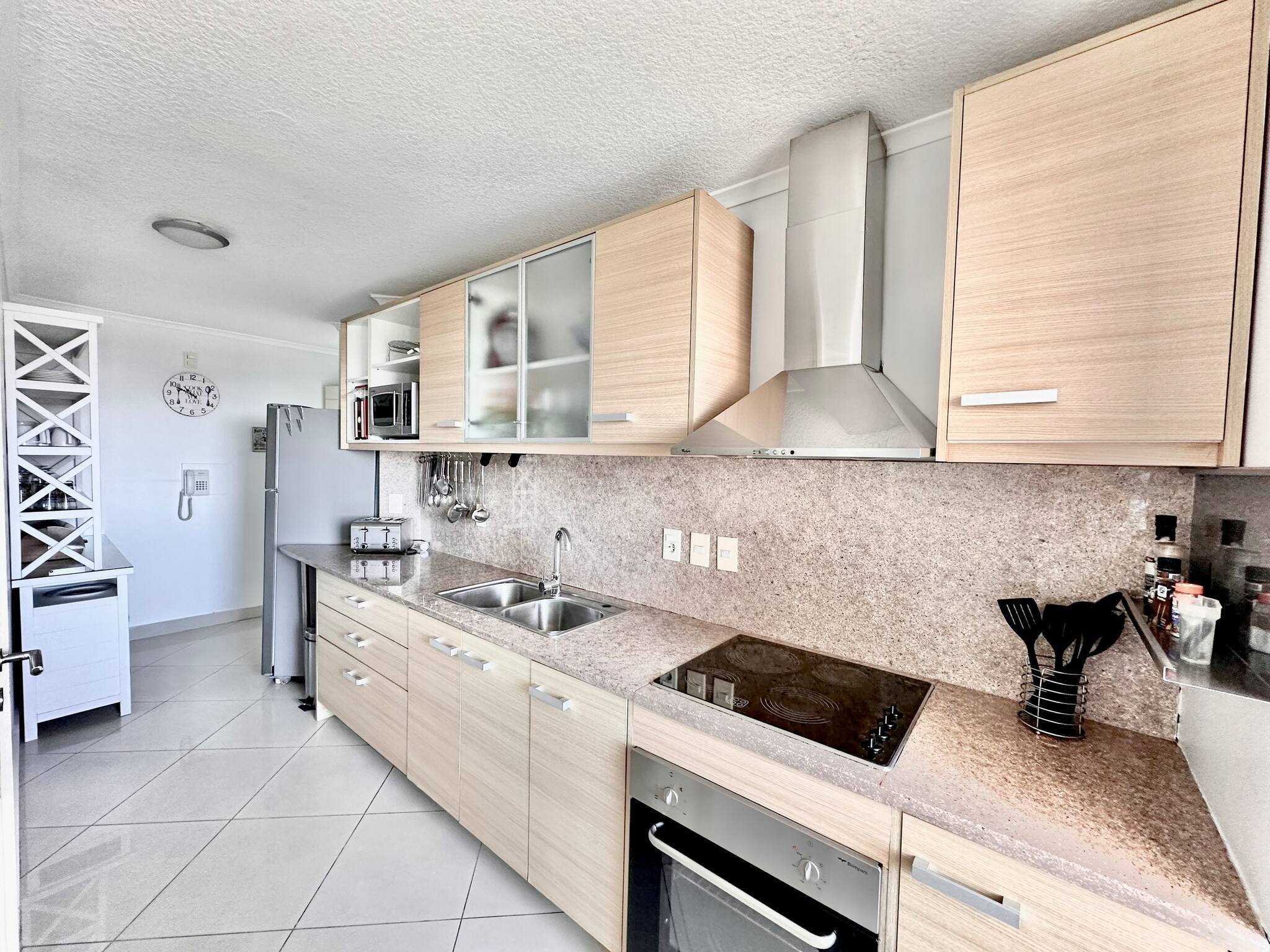 A cozinha é independente, eléctrica, está equipada com frigorífico, microondas, forno, congelador, louça/talheres, utensílios/cozinha, máquina de café, torradeira, jarro eléctrico e fogão.