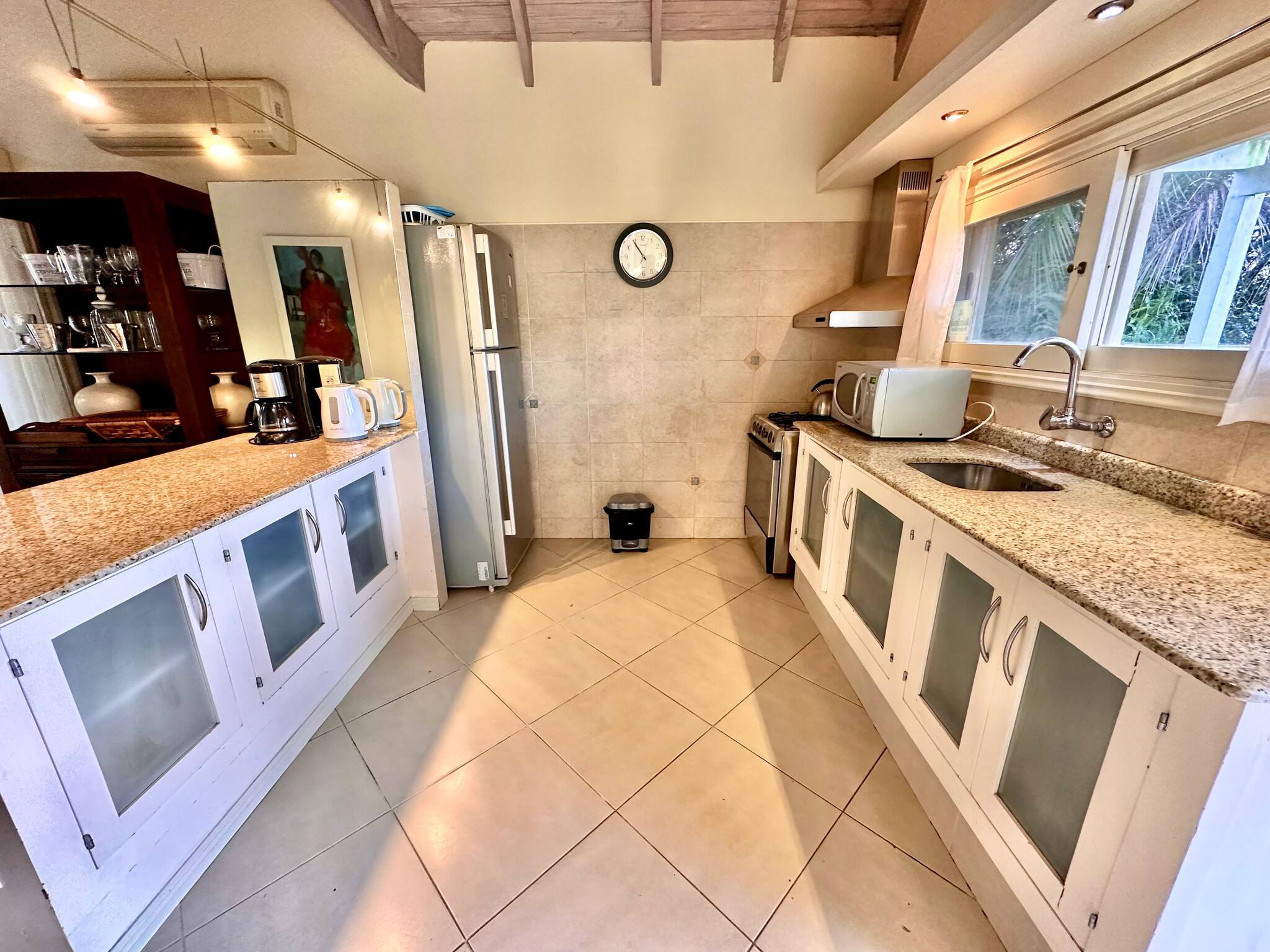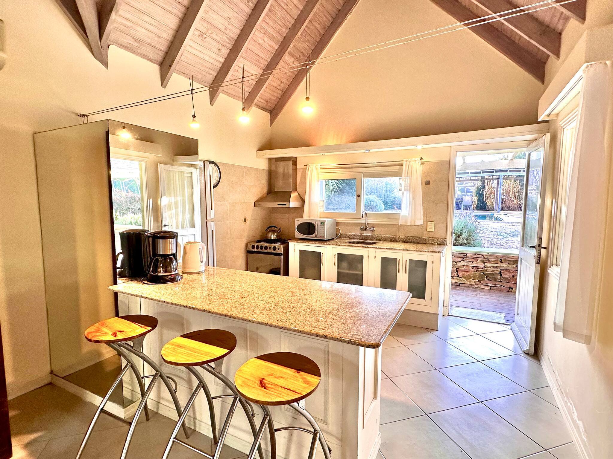 A cozinha é independente, de gás, está equipada com frigorífico, microondas, forno, congelador, máquina de lavar louça, louça/talheres, utensílios/cozinha, máquina de café, torradeira, jarro eléctrico e fogão.
